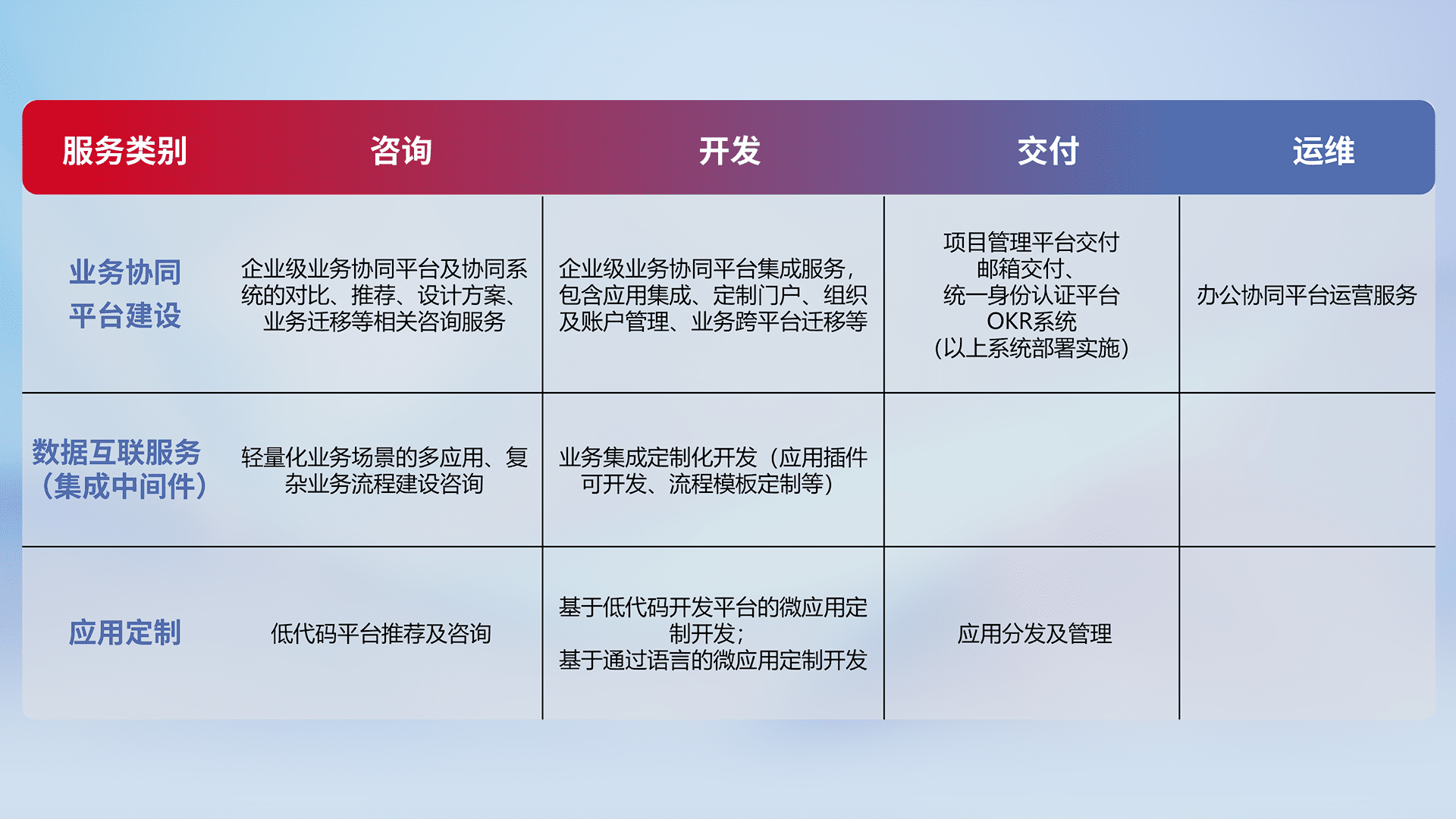 针对钉钉、、、企微、、IDaas等平台级产品提供产品的规划、、、方案、、、交付、、、、定制化开发等服务,,,,实现如统一协同办公、、、、智能客户服务、、、、混合会议管理、、、、智能数据查询、、等业务场景,,实现数字化转型。。。